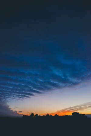 Cityscape with wonderful varicolored vivid dawn. Amazing dramatic blue cloud sky above dark silhouettes of city building roofs. Atmospheric background of orange sunrise in overcast weather. Copy space