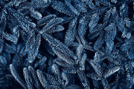Coniferous green branches texture. Background in blue tone. Dark night photo