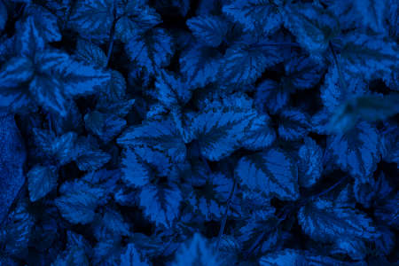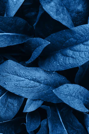 Glossy leaves colored in blue shade,color of the year 2020.Beautiful abstract background,copy space.Natural backdrop.Low key photography.