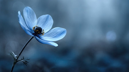 Single, vibrant blue flower, in sharp focus, is presented against a softly blurred, muted background of shades of blue. The flower's petals are detailed and delicate, and the background bokeh adds to the overall aesthetic. The image emphasizes the beautiful hues and texture of the bloom.
