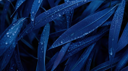 A striking close-up image of blue leaves adorned with droplets, showcasing nature
