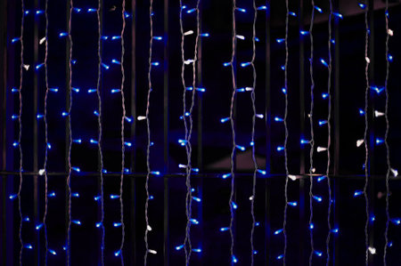 Beautiful abstract image of festive blue electric lights at night. Holiday decoration made of small electric lights.