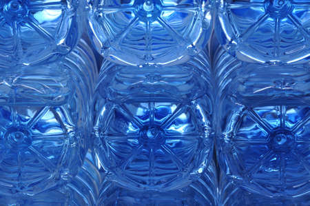 Horizontal color image with an overhead view of an empty clear plastic bottles upside down stacked on a blue background. Recycling and environment concept.