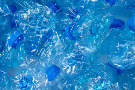 Crushed or crumpled clear plastic bottles. Plastic waste. Plastic recycling. Plastic pollution and waste management.