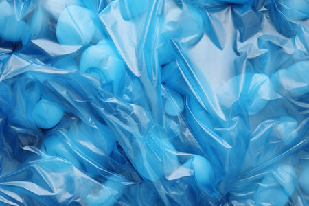 Plastic pollution. Waste management. Environmental protection. Blue creased texture polyethylene film cellophane bag collection on blur dark abstract background.