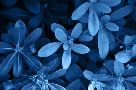 Closeup textured foliage toned in Classic Blue - color of the year 2020. Natural background with place for text.