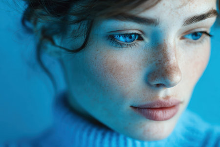 Female model with freckles and blue eyes poses against a blue background with soft lighting