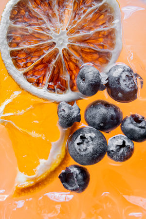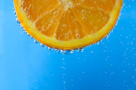 Close up of a fresh orange slice at top of image and facing forwards, suspended in sparkling bright blue water. Oxygen bubbles float upwards and cover the front and edges of the fruit.