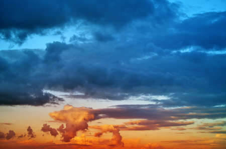 Heavenly landscape. Abstract natural background with dramatic sunny sky at sunset or dawn with beautiful clouds of orange and blue