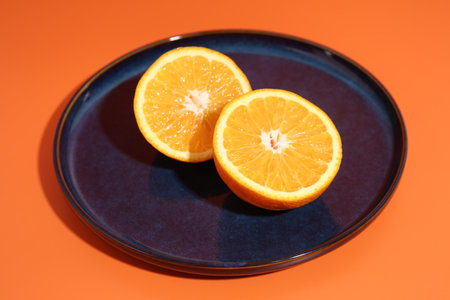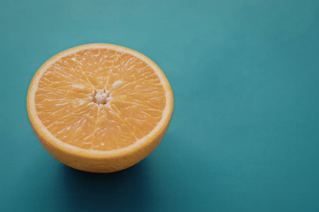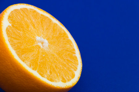 Close-up of an orange cut in half on a blue background. Free space for text.