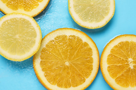 Slices of oranges on a turquoise wooden background. Selective focus, copy space background, top view