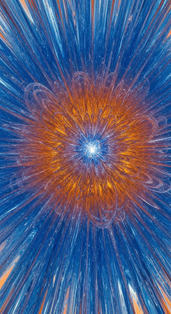 A vibrant abstract artwork featuring a bright blue and orange explosion of light and energy
