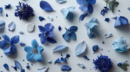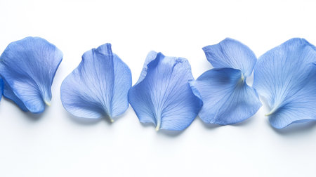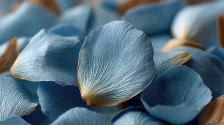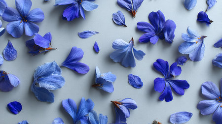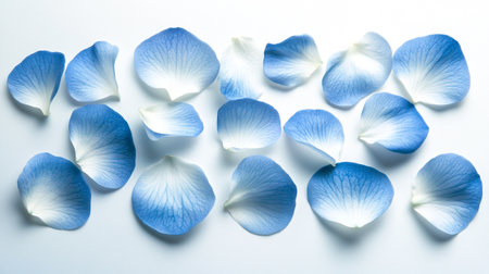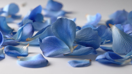 A stunning arrangement of delicate blue flower petals scattered across a smooth surface, showcasing their fine textures and gradients, perfect for serene and calming imagery.