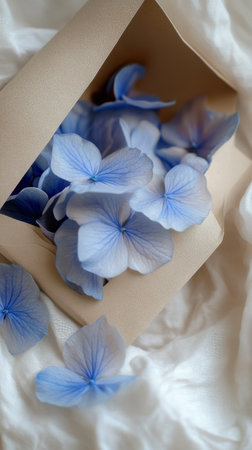 Blue hydrangea petals in an envelope on white fabric, soft and delicate floral arrangement. Natures elegance and romantic concept