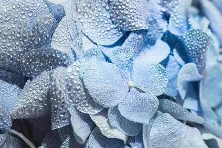 Blue hydrangea with with water dew on petals or after rain. Macro photo. Selective focus