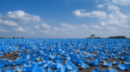 Blue flower petals on the ground with blue sky and white clouds