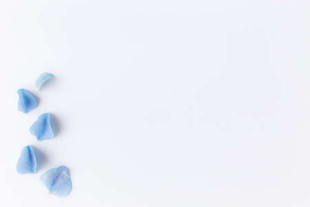 Flat lay with hydrangea or hortensia blue petals, white background
