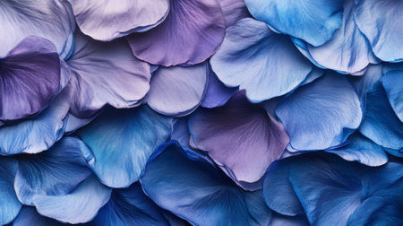 This stunning close-up shows soft blue and purple flower petals overlapping, creating an elegant and tranquil background for various floral designs and artistic projects.