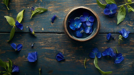 A serene arrangement of blue violet flowers placed in a bowl on a rustic wooden table. Surrounding petals and leaves add a tranquil and natural atmosphere.