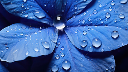 Blue Hydrangeas flowers with water drops background. Closeup of blossom with glistening droplets. Generative AI.
