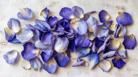High-angle, shot captures a collection of intensely colored purple and lighter lavender flower petals strewn randomly across a pale, slightly distressed or textured surface, creating an appealing natural arrangement.