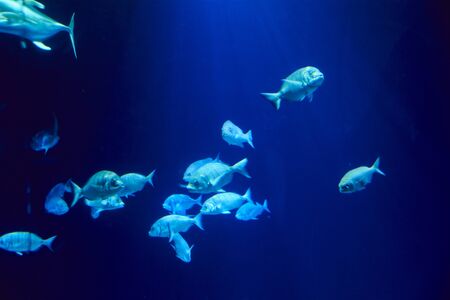 Colorful fishes in the deep under water, sea fish in zoo aquarium, close up