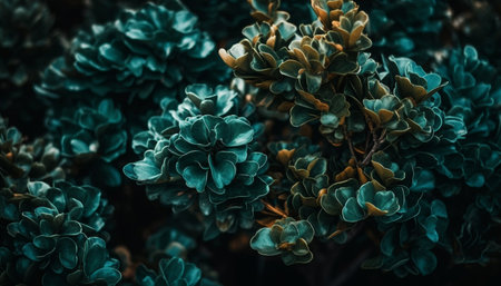 Image of emerald blue leaves, macro photo realistic illustration, dark background. Made with Generative AI