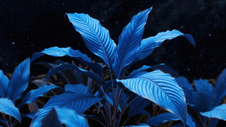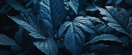 This captivating image showcases a closeup of lush indigo hued leaves with intricate mesmerizing patterns and textures against a dark dramatic background The vibrant almost neon like shades of blue