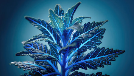 A striking close-up of a vibrant, stylized plant, possibly a variety of kale or a similar leafy green, rendered in intense electric blue and deep purple hues. The foliage appears to glow from within, with light emanating along the central veins and stem, creating a luminous and ethereal effect. The intricate surface of the leaves is adorned with delicate, sparkling water droplets or frost, reflecting light and adding a touch of magic or scientific precision to the composition. The background is a smooth, gradient dark blue, providing a dramatic contrast that accentuates the plant's brilliant colors and intricate details. This imagery evokes themes of futuristic nature, artistic interpretation, and vibrant botanical beauty.