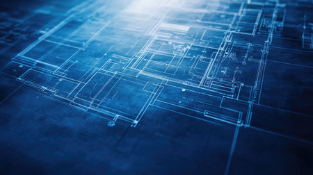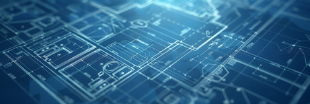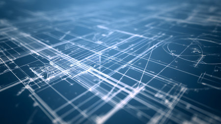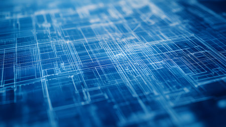 This image features a detailed architectural blueprint design rendered in blue tones. The technical drawing includes grids and outlines, showcasing precision and creativity in construction projects. Ideal for design and engineering themes.