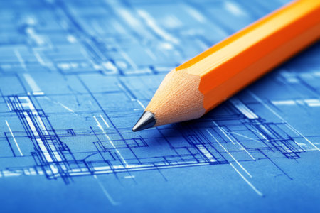 An orange pencil sits poised over intricate details of an architectural blueprint, emphasizing the creativity and precision involved in design work at a bright workspace.