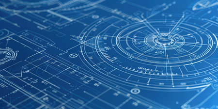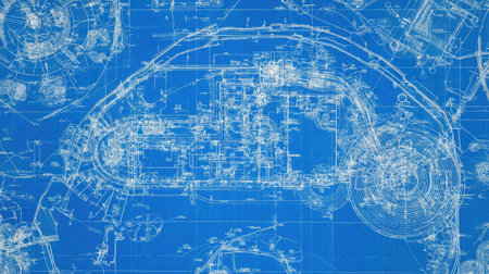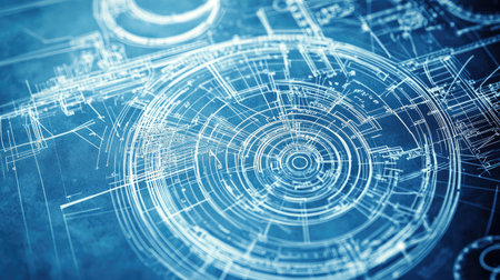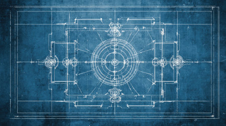 Detailed blueprint design showcasing intricate patterns and geometric shapes, ideal for engineering and architecture projects focused on innovation and precision.