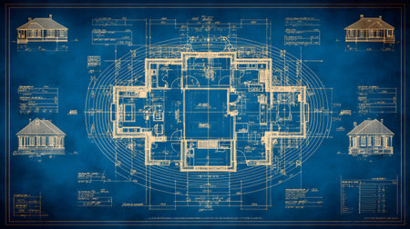 A detailed architectural blueprint showcasing technical drawings and annotations on a blue background. Ideal for design and construction project references.