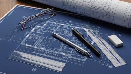 This striking image features a detailed blueprint of construction design with technical instruments like a compass and caliper on a blue background, symbolizing precision.