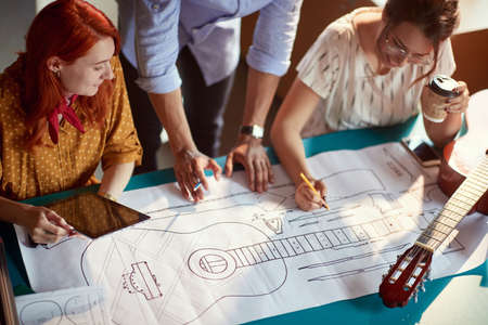 Young creative colleagues in a pleasant atmosphere in the office are working on a draft of a new guitar design