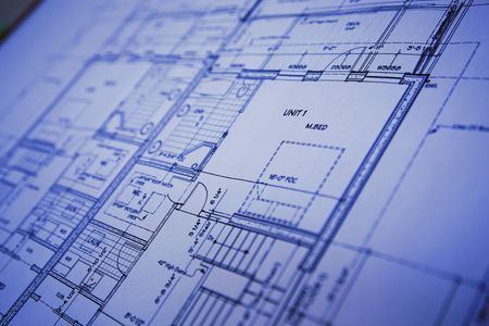 Detailed architectural blueprint drawing on a blue background, used in engineering, construction, or architectural design planning.