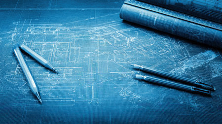 Detailed view of blueprints and technical drawings featuring drawing tools and pens on a blue background, ideal for design and engineering projects and inspirations.