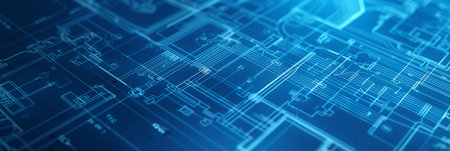 Digitally created abstract blueprint design in blue tones showcases intricate details and grids, symbolizing technology advancement and engineering creativity.