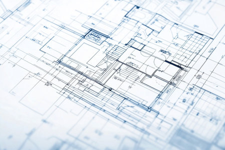 Intricate blueprints showcasing precise measurements and detailed layouts, spread out on a sleek surface, essential for meticulous construction and design development.