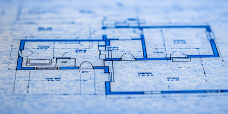 Blueprints, Architectural Floor Plan Drawing with Blue and White Lines, Construction Background