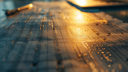 An architectural blueprint unfurls on a polished wooden floor, beautifully lit by gentle sunlight casting soft shadows.