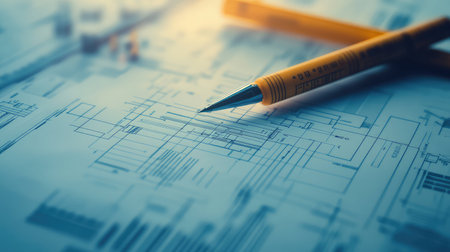 Close-up of carpenter pencil resting on blueprint, highlighting construction planning and design