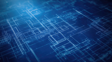 Digitally created abstract blueprint design in blue tones showcases intricate details and grids, symbolizing technology advancement and engineering creativity.