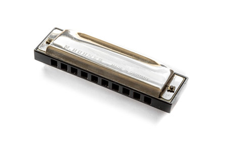 Harmonica on a white background, a classic musical instrument ideal for jazz, blues and folk music.