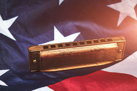 Harmonica on background of the flag of the United States of America. Musical instrument.Stars and stripes in sunlight