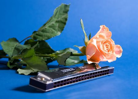 A closeup of a harmonica with a bouqet of flowers over a gradient background.