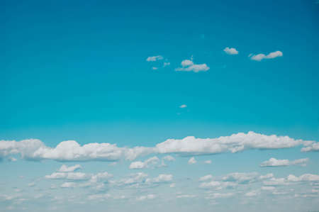 Blue sky with fluffy clouds on a windy day in spring. Abstract template with copy space