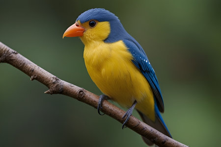Colorful bird sitting on a branch on a green blurred background. International Bird Day