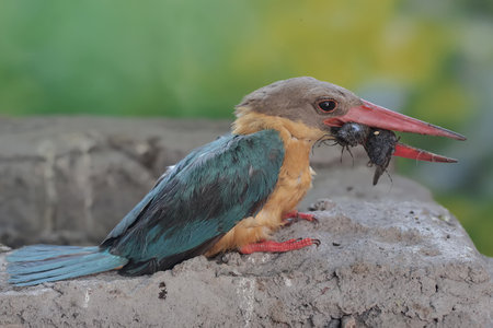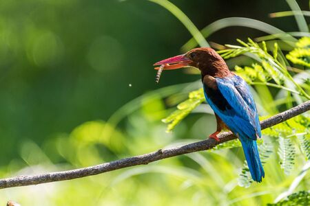 White-throated kingfisher (Halcyon smyrnensis) perched and eating
