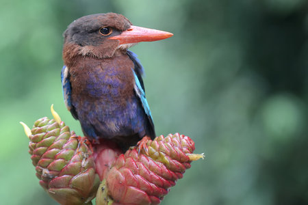 White-throated Kingfisher (Halcyon smyrnensis) perched on a flower